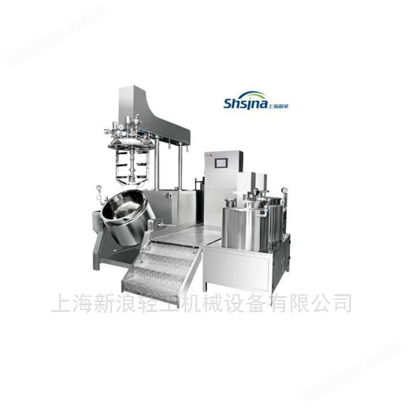 SXL系列药膏膏体真空均质乳化机由乳化锅(可升降锅盖、翻转式锅体)水锅、油锅、真空装置、加热及温度控制系统、冷却系统、电器控制系统等组成。原料在水锅、油锅内通过预热、搅拌进行混合反应后,由CBI分散系统在无外部动力情况下产生的高速离心力同时吸入均质工作腔体,在定转子高速作用下所有物料瞬间被剪切、分散,再由乳化锅上部双向搅拌桨混合均匀;再通过内外循环管路流回罐里,继续混合、剪切,也可以通过切换管路阀门来调节循环路径的长短,从而控制批次流量;