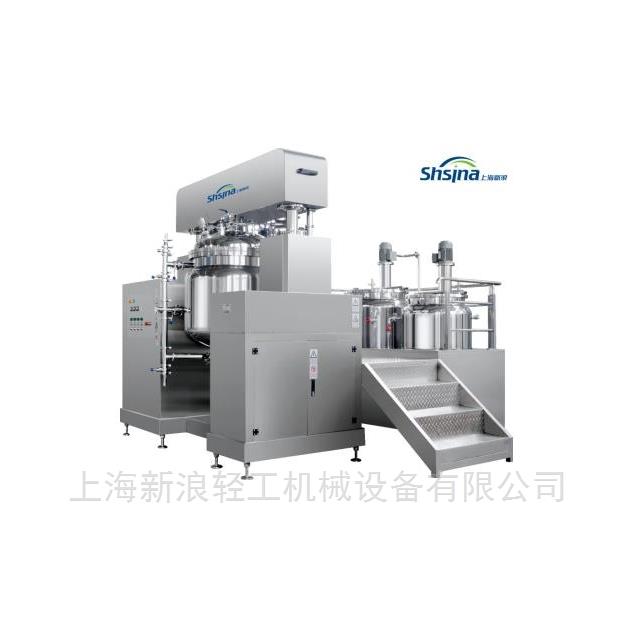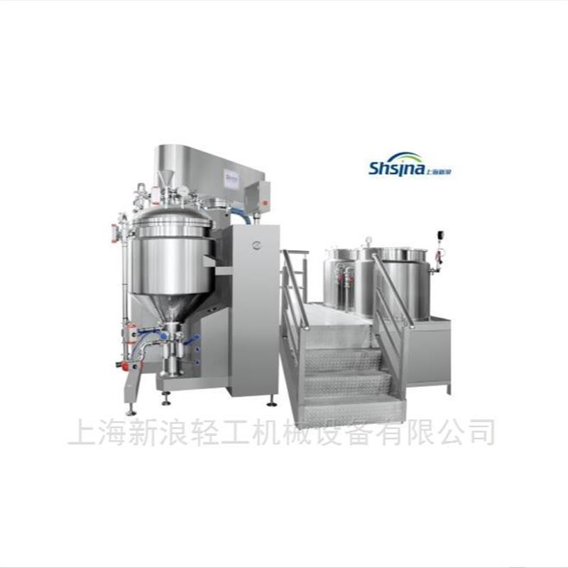 SXL系列化妆品牛奶面霜真空均质乳化机由乳化锅(可升降锅盖、翻转式锅体)水锅、油锅、真空装置、加热及温度控制系统、冷却系统、电器控制系统等组成。原料在水锅、油锅内通过预热、搅拌进行混合反应后,由CBI分散系统在无外部动力情况下产生的高速离心力同时吸入均质工作腔体,在定转子高速作用下所有物料瞬间被剪切、分散,再由乳化锅上部双向搅拌桨混合均匀;再通过内外循环管路流回罐里,继续混合、剪切,也可以通过切换管路阀门来调节循环路径的长短,从而控制批次流量;