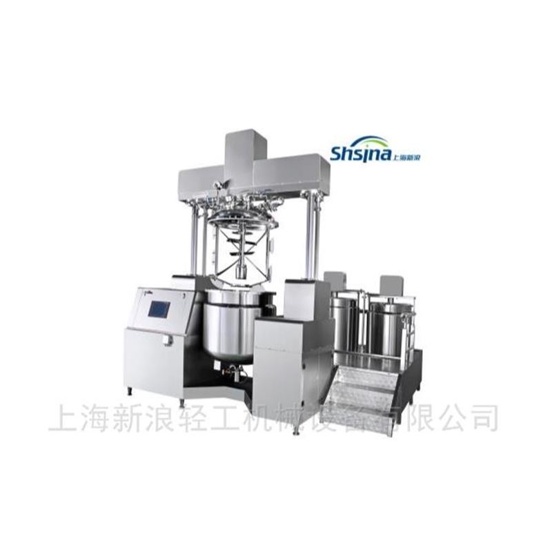 SXL系列固液混合真空均质乳化机由乳化锅(可升降锅盖、翻转式锅体)水锅、油锅、真空装置、加热及温度控制系统、冷却系统、电器控制系统等组成。原料在水锅、油锅内通过预热、搅拌进行混合反应后,由CBI分散系统在无外部动力情况下产生的高速离心力同时吸入均质工作腔体,在定转子高速作用下所有物料瞬间被剪切、分散,再由乳化锅上部双向搅拌桨混合均匀;再通过内外循环管路流回罐里,继续混合、剪切,也可以通过切换管路阀门来调节循环路径的长短,从而控制批次流量;